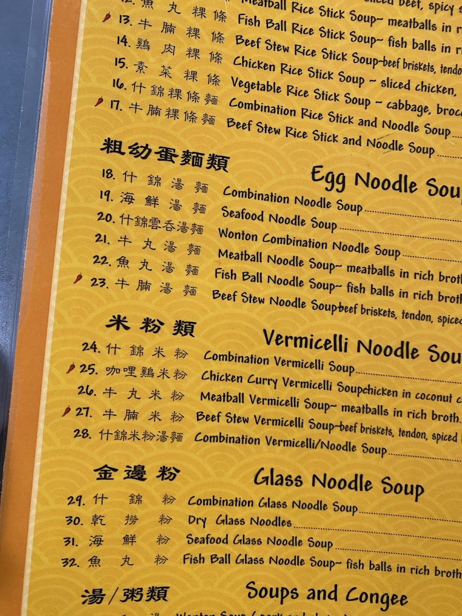 Highlights include rich noodle soups like Beef with Tendon, Satay Beef, or a Combination Wonton Noodle Soup, each served with generous portions of meat and fresh garnishes. For those who prefer something crispy and shareable, the Pan Fried Pot Stickers, Crispy Chicken Wings, and various fried flour cakes provide a satisfying contrast to the warm broths.